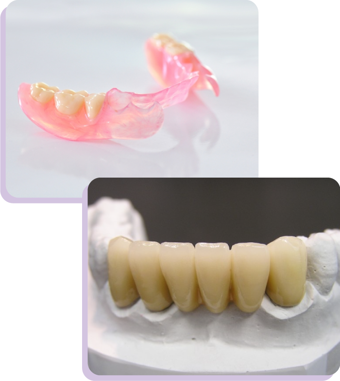 当院ではブリッジ・入れ歯共に保険適用、自由診療のものと幅広く取り扱っております。セラミックブリッジ、金属床義歯、バネのない入れ歯(ノンクラスプデンチャー)など。